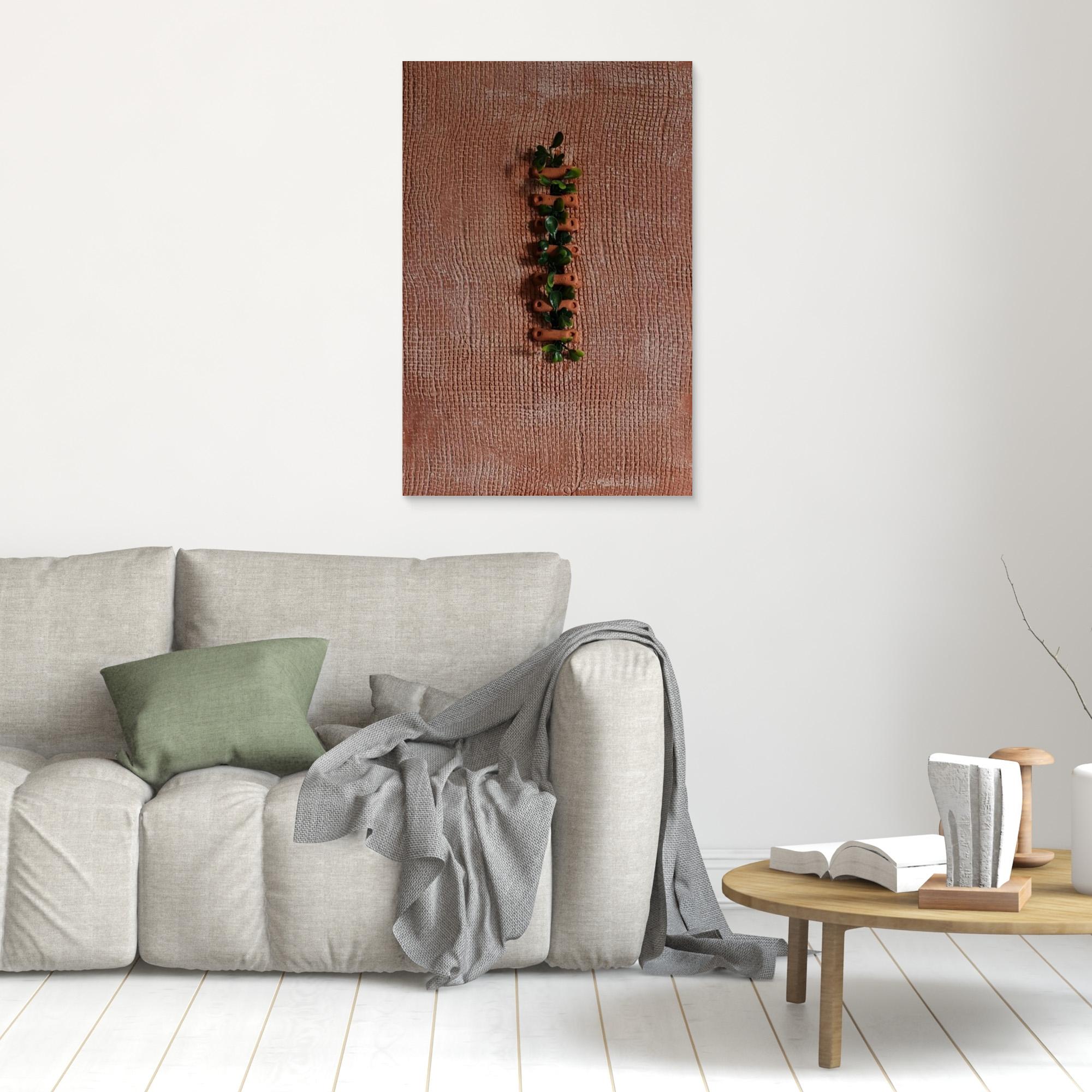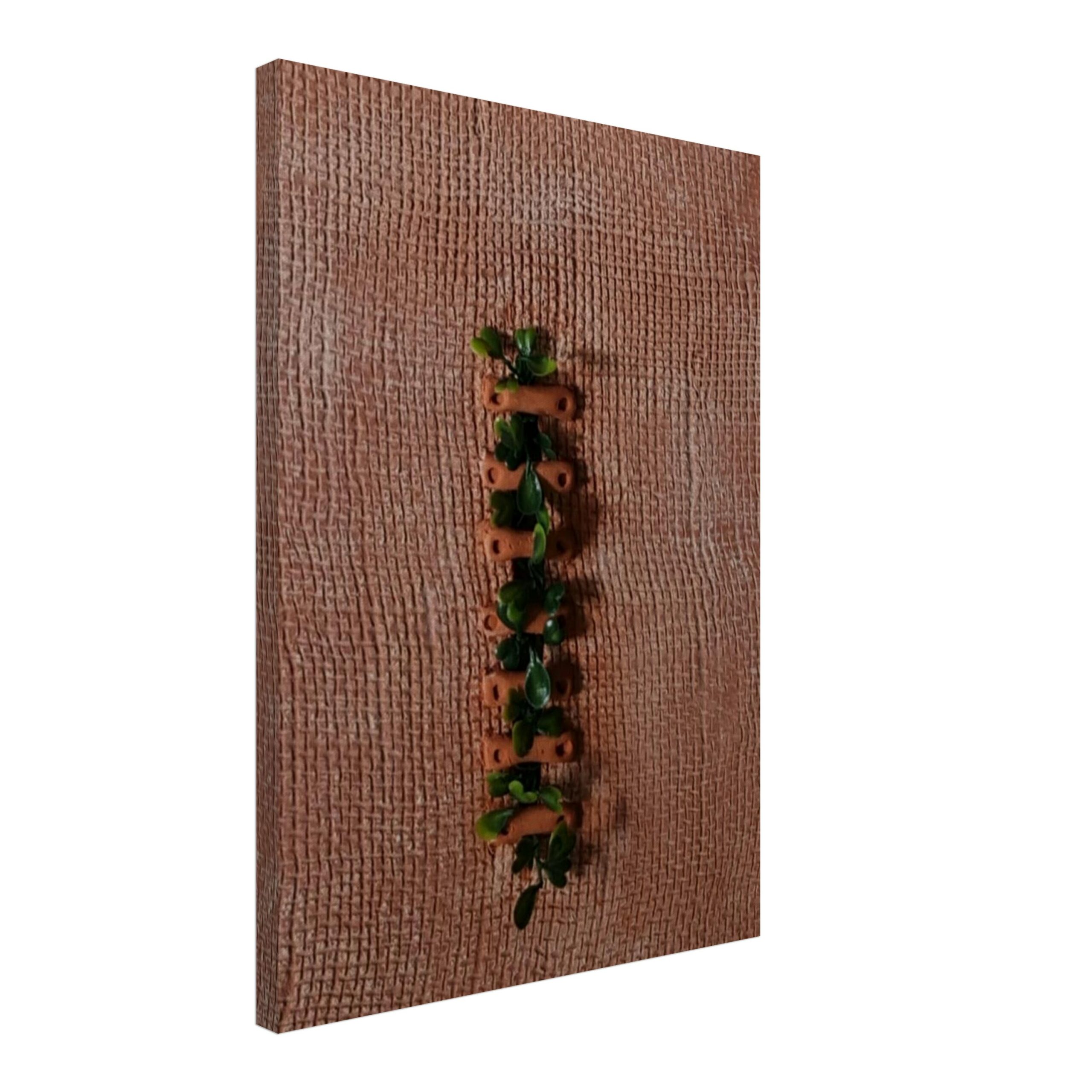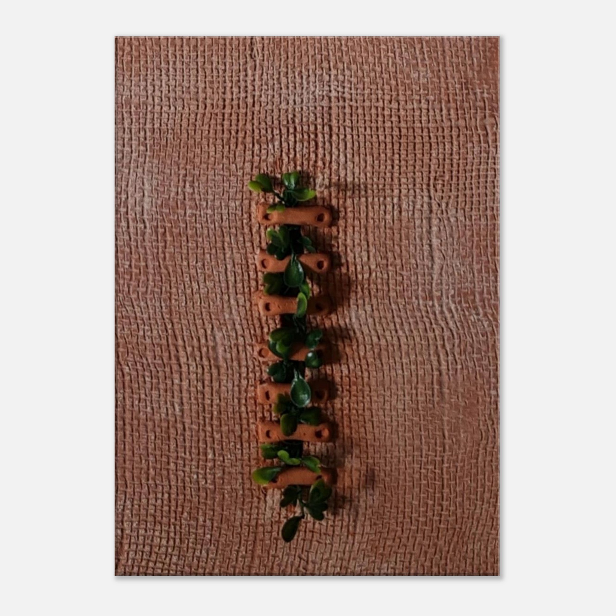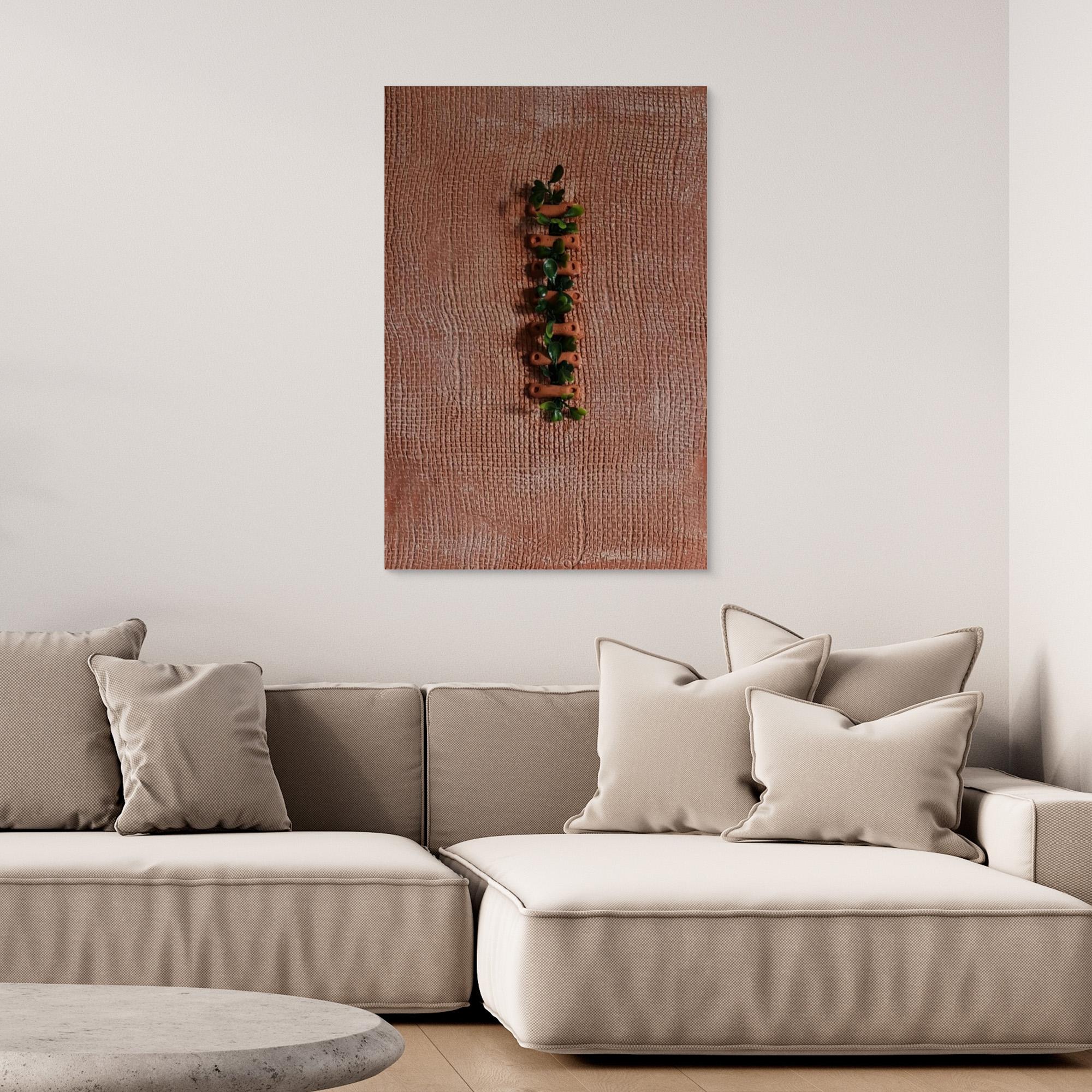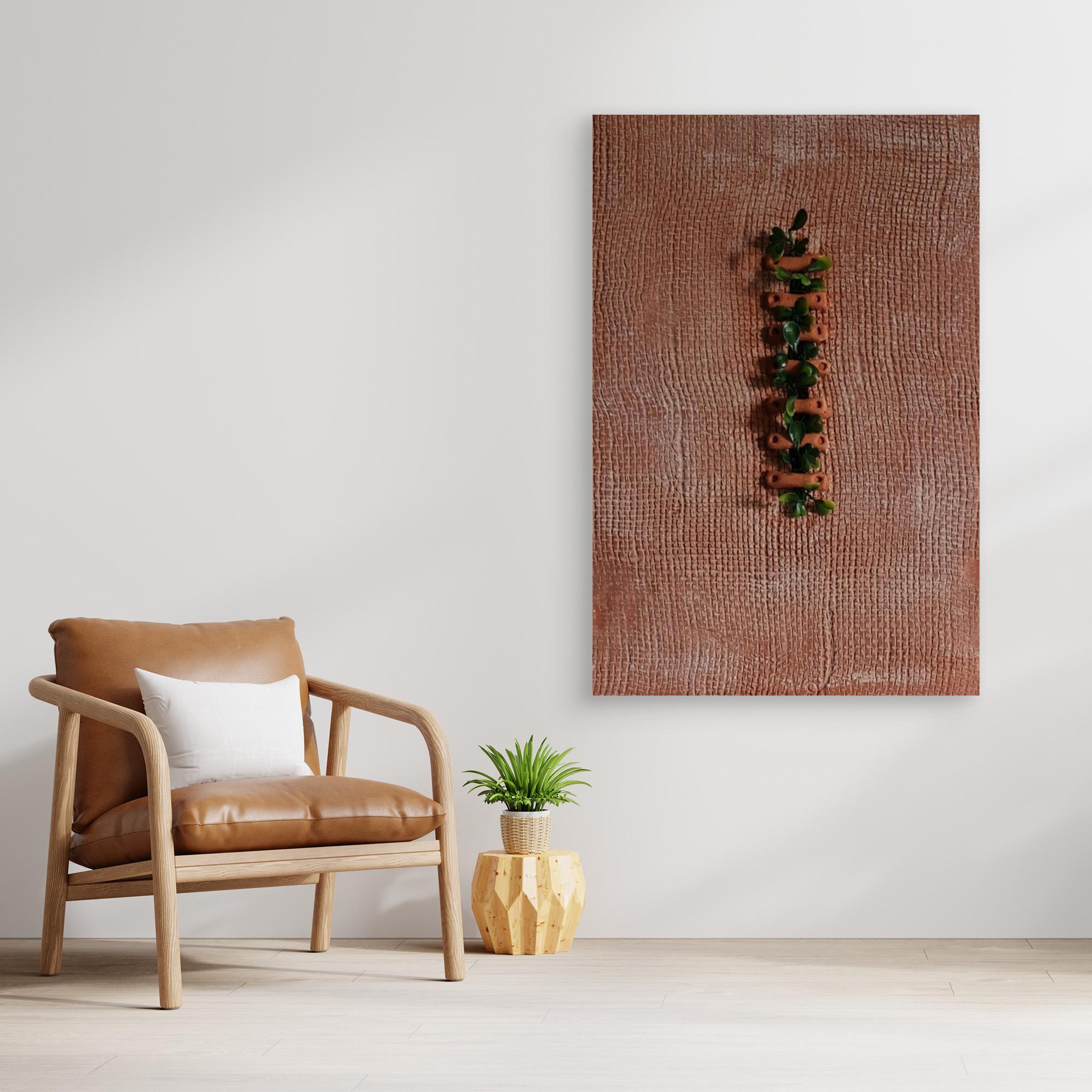 A textured clay surface, warm in its earthy terracotta tone, forms the grounding for this minimalist yet deeply symbolic piece. From its center, a vertical arrangement of small clay elements cradles tender green leaves, as if life itself is breaking through the stillness of the soil. The work evokes a quiet dialogue between nature and matter, where resilience, growth, and renewal emerge from the heart of the earth.