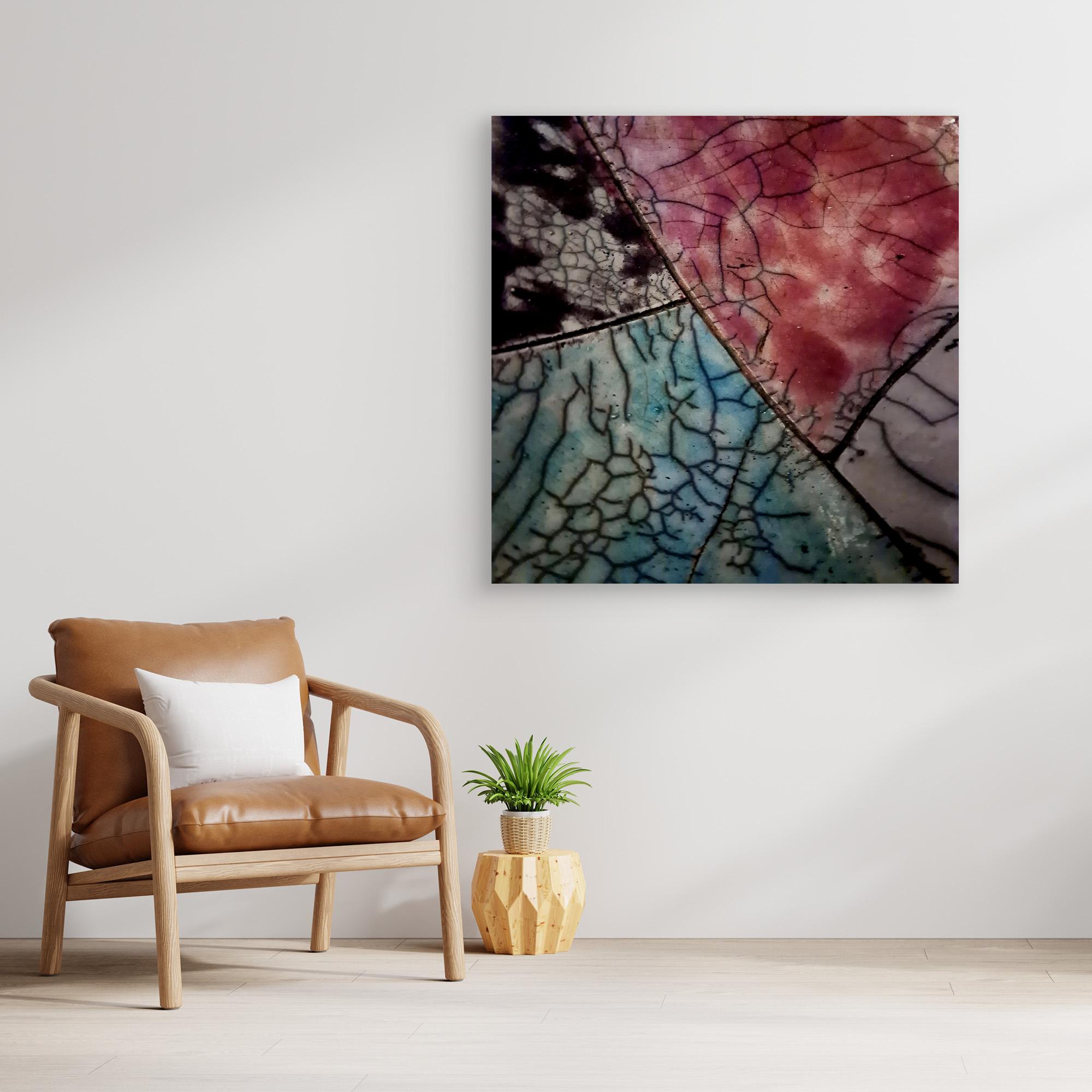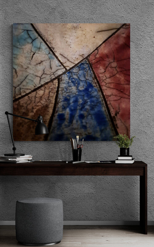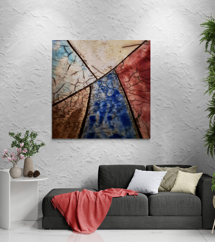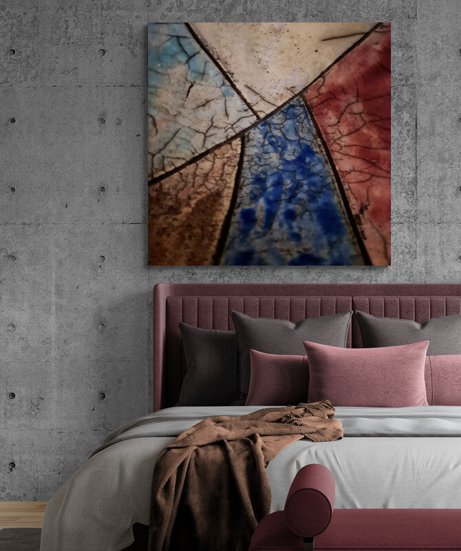 This ceramic artwork by Maryam Eskandari reveals a poetic interplay of color and texture. Veins of crackled glaze weave through deep blacks, gentle blues, and warm reds, creating a map-like surface that feels both ancient and alive. Each fractured line becomes a pathway of memory, while the luminous hues suggest shifting skies and landscapes. The piece embodies the beauty of imperfection , a reminder that even through breaks and cracks, light continues to shine.