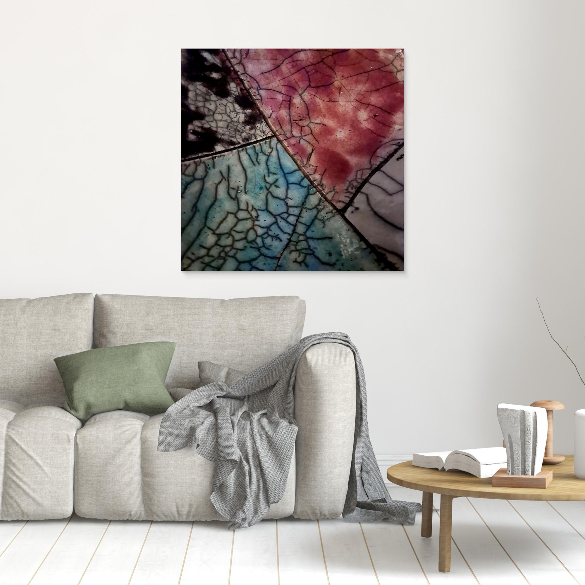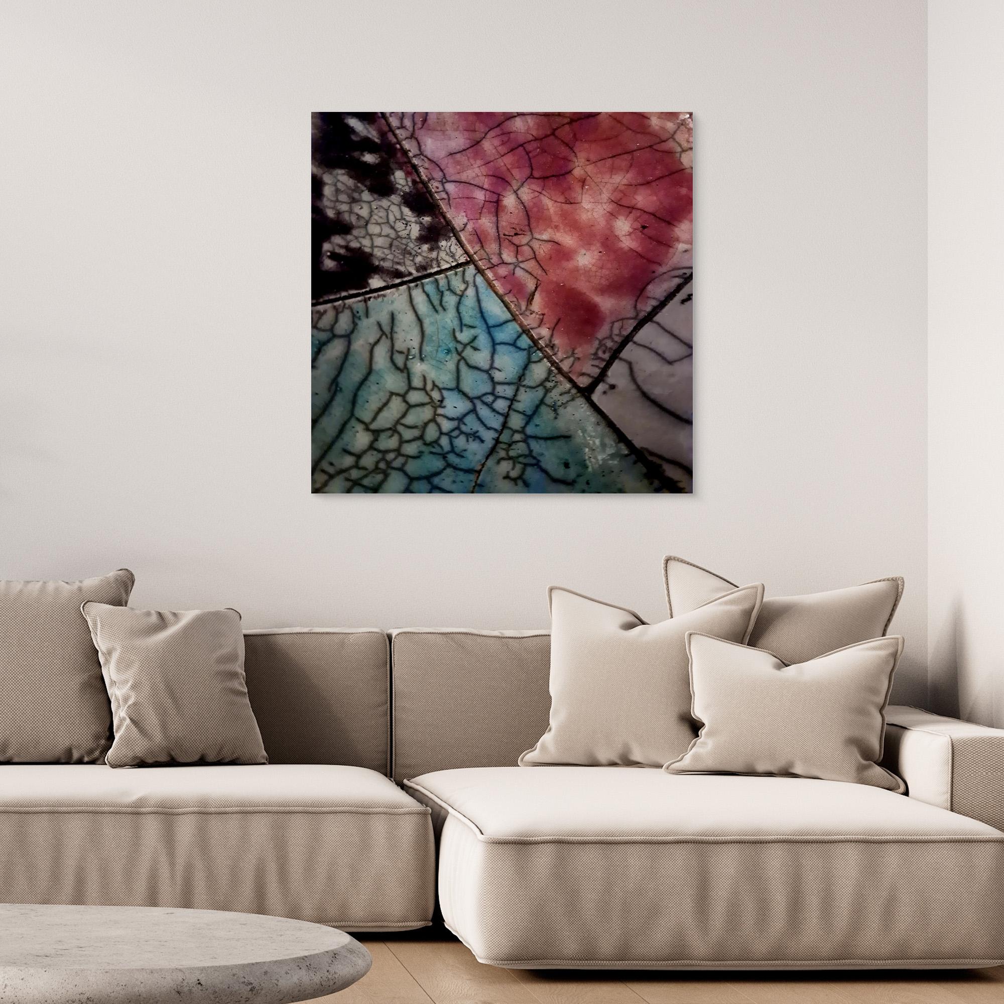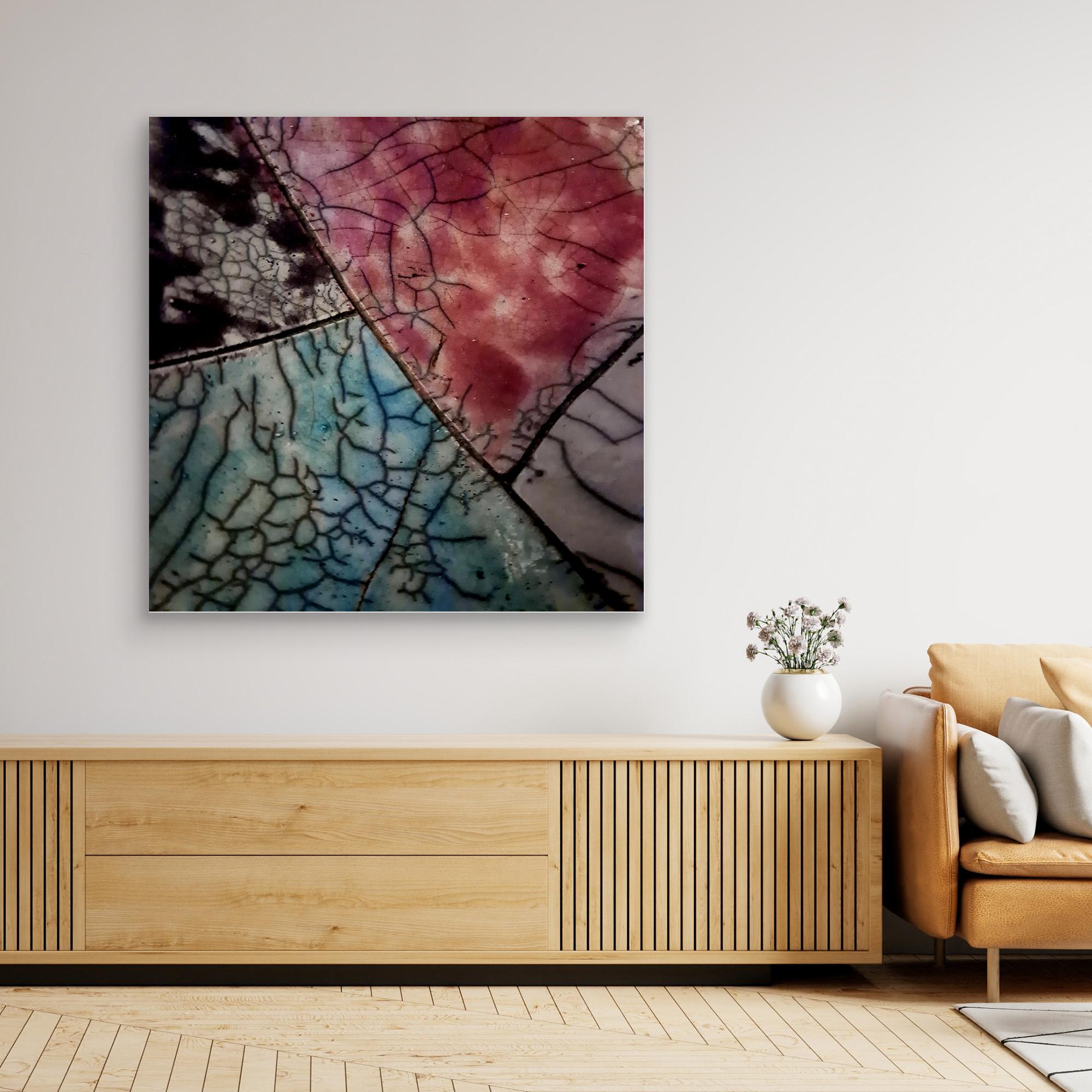 This ceramic artwork by Maryam Eskandari reveals a poetic interplay of color and texture. Veins of crackled glaze weave through deep blacks, gentle blues, and warm reds, creating a map-like surface that feels both ancient and alive. Each fractured line becomes a pathway of memory, while the luminous hues suggest shifting skies and landscapes. The piece embodies the beauty of imperfection , a reminder that even through breaks and cracks, light continues to shine.